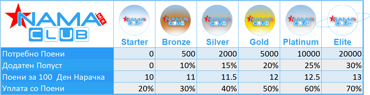 Добредојдовте во NAMA Club, ексклузивната програма за лојалност која ги наградува нашите најверни клиенти. Со шест нивоа на членство, имате можност да заработувате поени, да добивате додатни трајни попусти и да користите поени за плаќање на вашите омилени производи.