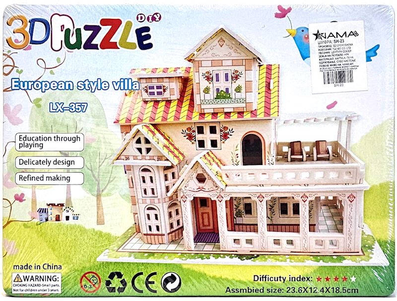 Откријте го светот на архитектонската убавина и креативната забава со нашата 3D Сложувалка – European Style Villa! Овој модел е внимателно дизајниран за да ја долови класичната убавина на европските вили, со нивната елеганција, симетрија и детална архитектура. Со секое парче кое внимателно се вклопува, вие ќе имате можност да создадете прекрасна минијатурна вила која изгледа како да е директно од романтичните улици на Европа. Овој проект е идеален за деца, тинејџери и возрасни кои сакаат да се ангажираат во креативни и едукативни активности, развивајќи го нивниот талент за детали и логичко размислување.
