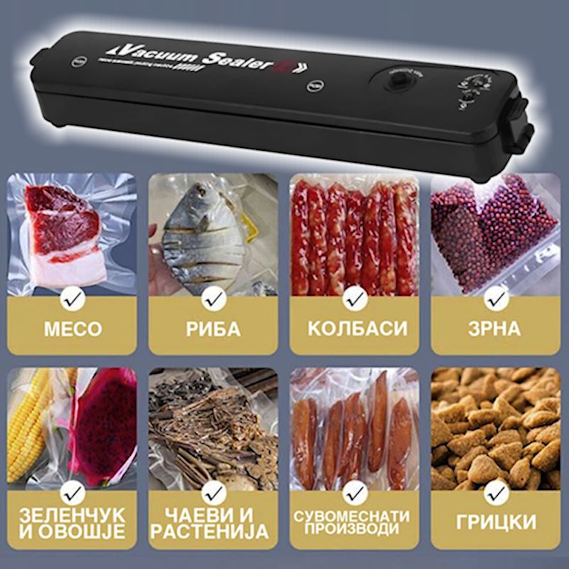 Одличен е за вакумирање и на сува и на влажна храна, како и за собирање на месо и месни преработки, на зеленчук и овошје, како и за вакуумирање на зачини и други производи. Со помош на овој апарат, може да го пролонгирате рокот на многу производи без да ги загубите нивните квалитет и свежина.