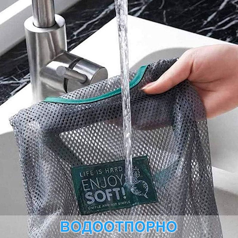 Благодарение на мрежестиот материјал, чантата се чисти со едноставно испирање под вода. Мрснотии и нечистотии не се задржуваат, што ја прави оваа чанта совршено хигиенско решение за складирање на храна.