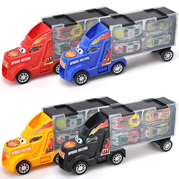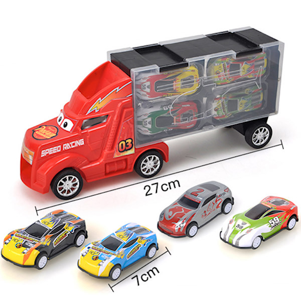 Сет од пет играчки – камион носач и четири метални автомобили.