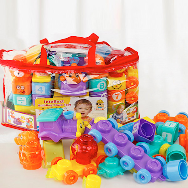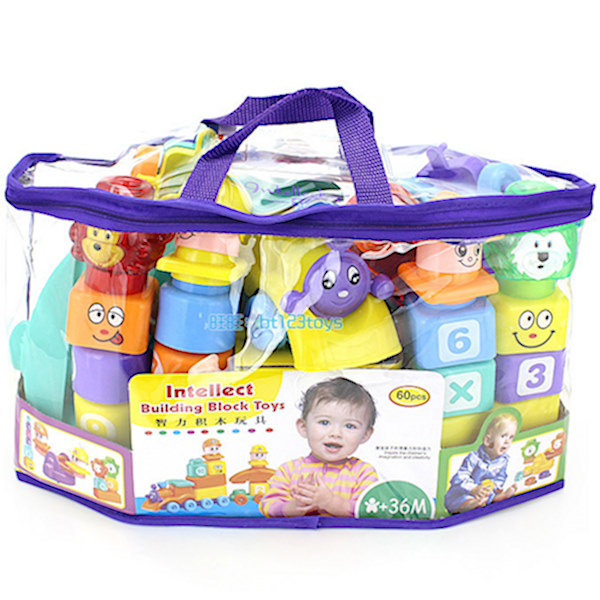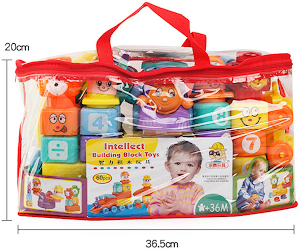 Прекрасен креативно едукативен сет од 60 големи коцки во ПВЦ вреќа за чување и складирање.