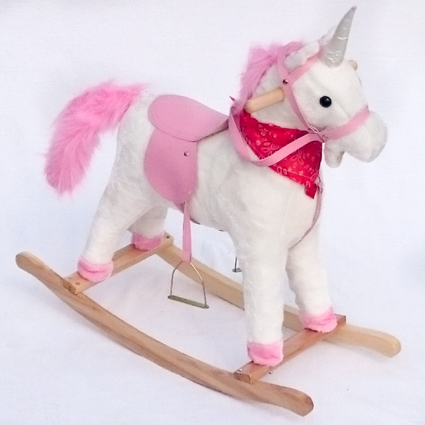 Коњче клацкалка еднорог за мали принцези обложено со плишан материјал, има и вграден додаток на батерии за звук.