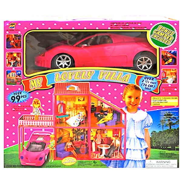 Оваа голема двоспратна куќа (вила) за кукли комплетно опремена со мебел и автомобил е сон на секое девојче.