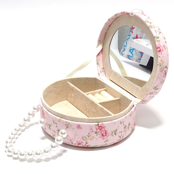 Кутијата има вградено прегради за прстени, огрлици, нараквици и друг накит. А на капакот има исклучително праткично огледало.