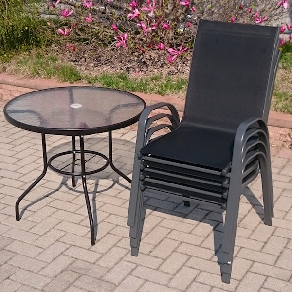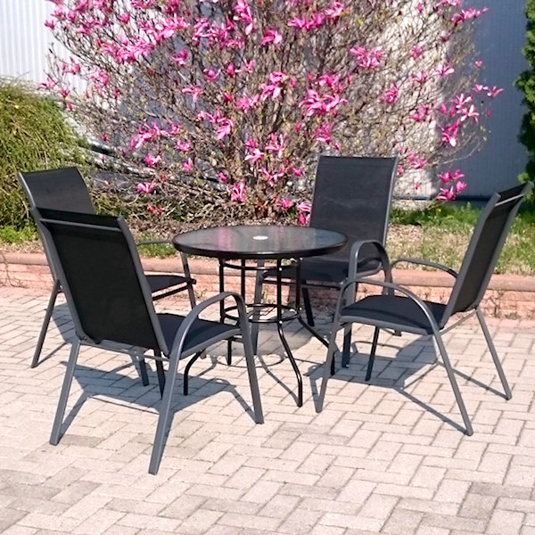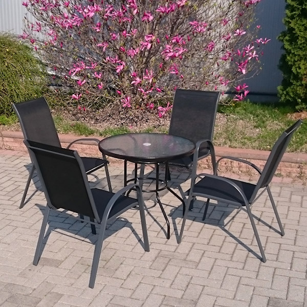 Летна гарнитура за седење со маса, изработена од метал и специјално водоотпорно платно.