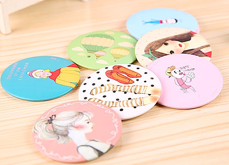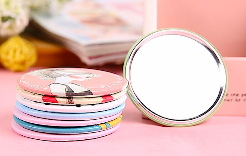 Ултра практично мало џебно козметичко огледало. Достапно во повеќе дезени.