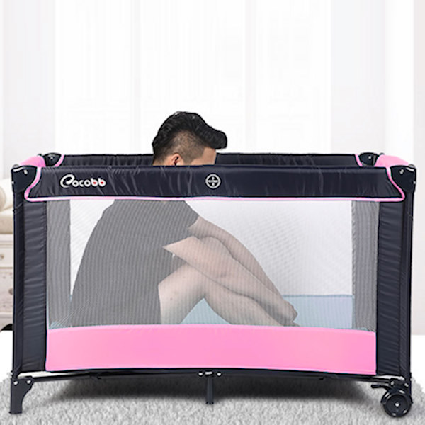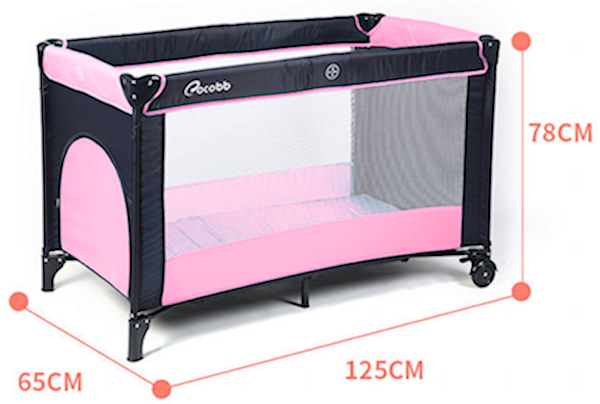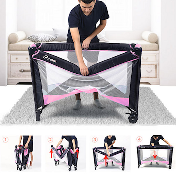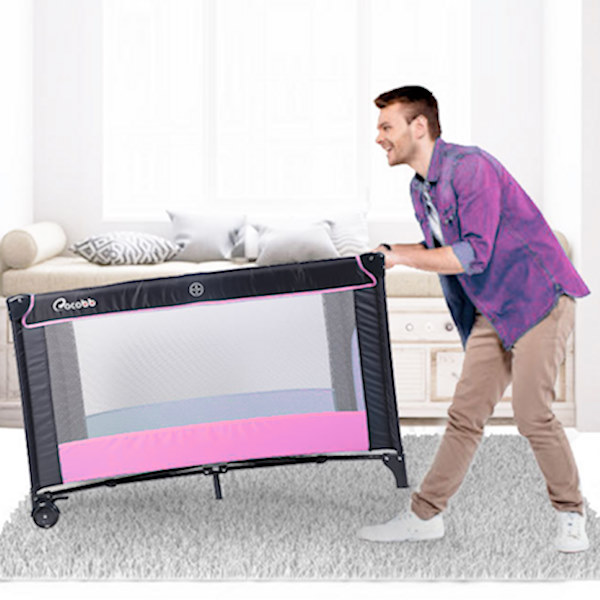 Високо квалитетен, практичен и преносен розев детски кревет на расклопување со тркалца.