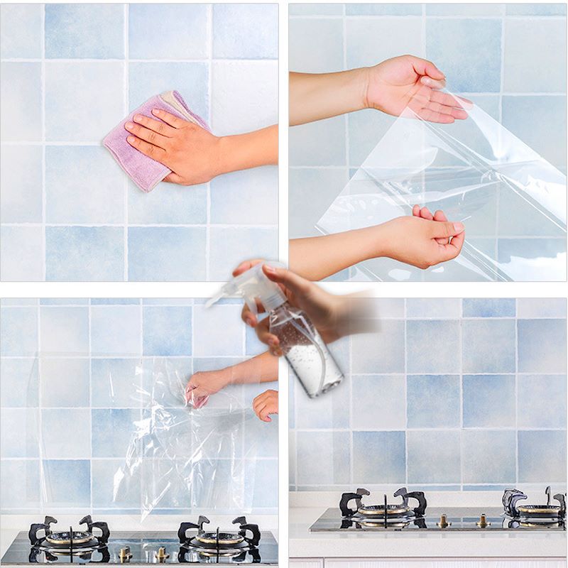 Фолијата има димензии приближно 68cm × 45cm, доволно голема за да покрие големи делови од плочки, задната страна од шпоретот или ѕидните панели во кујната. Пакувањето доаѓа со случаен избор на боја, но фолијата секогаш е проѕирна, што ја прави универзална и естетски прилагодлива.