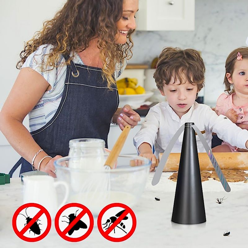 За разлика од спреевите и свеќите со инсектициди, Репелерот за Муви не испушта никакви хемиски супстанции. Тој работи само со физички методи – светлина и движење – што го прави совршен избор за поставување покрај храна, пијалаци или деца.