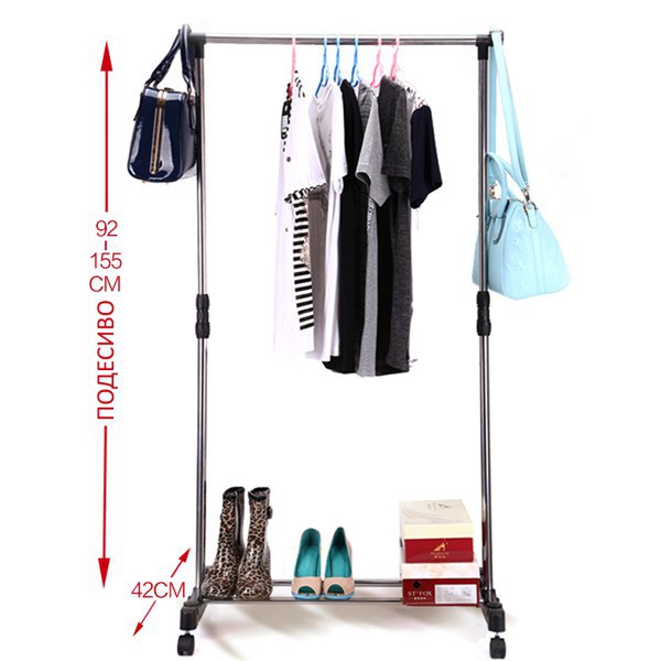 Kвалитетен двоен штендер со тркала на и опција за телескопско подесување на висината, со кој облеката ќе ви биде секогаш на дофат, а може и да ја возите низ домот.