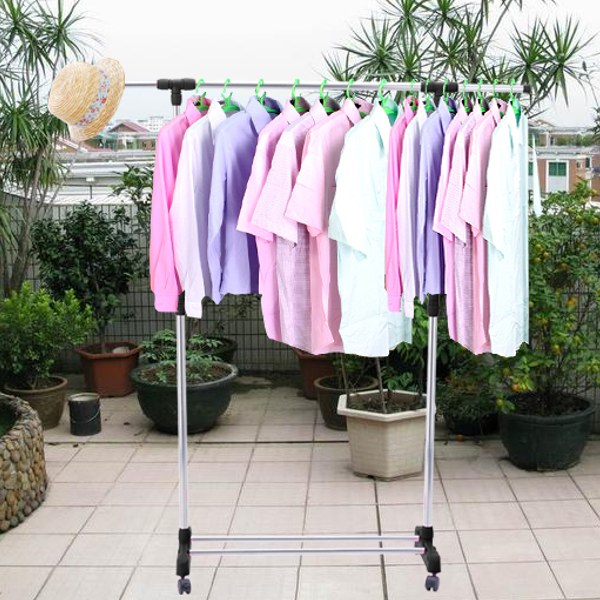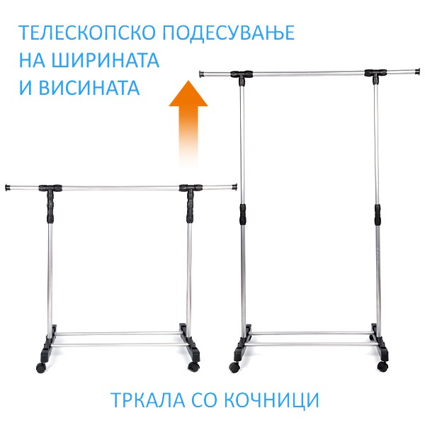 Kвалитетен комбиниран штендер со тркала на и опција за телескопско подесување на висината, со кој облеката ќе ви биде секогаш на дофат, а може и да ја возите низ домот.