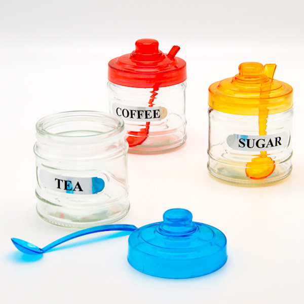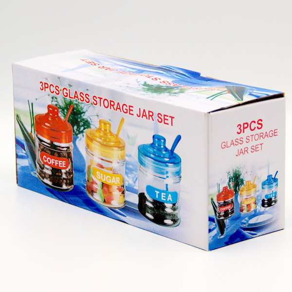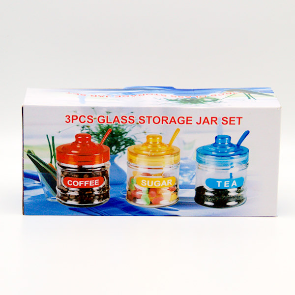 Сет од 3 стаклени тегли со капак и лажичка за складирање на шеќер, чај и кафе или други зачини по Ваша желба.
