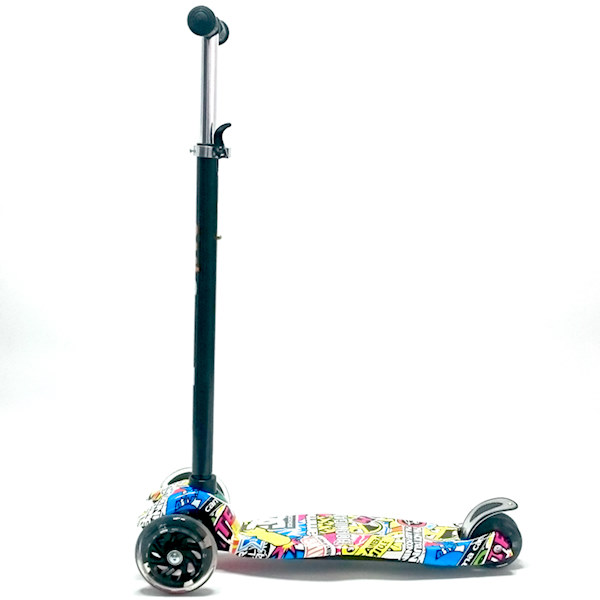 Квалитетен детски тротинет (скутер) со две предни и дупли задни светлечки силиконски тркала за дополнителна стабилност.