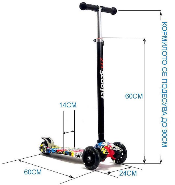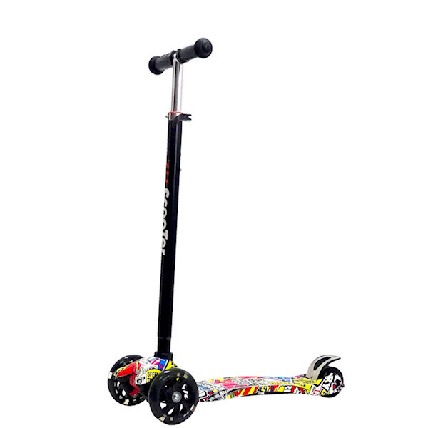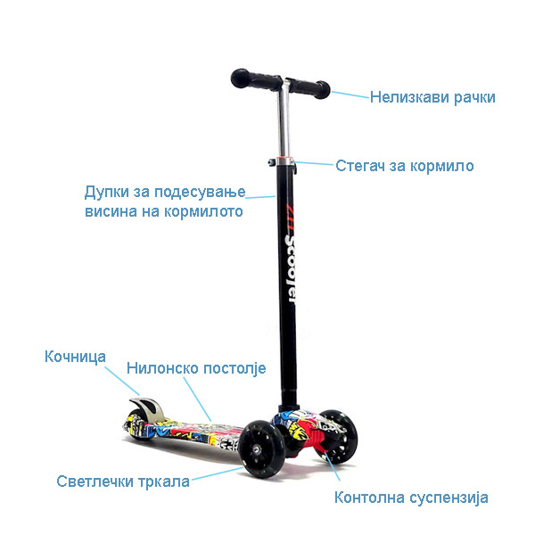 Квалитетен детски тротинет (скутер) со две предни и дупли задни светлечки силиконски тркала за дополнителна стабилност.