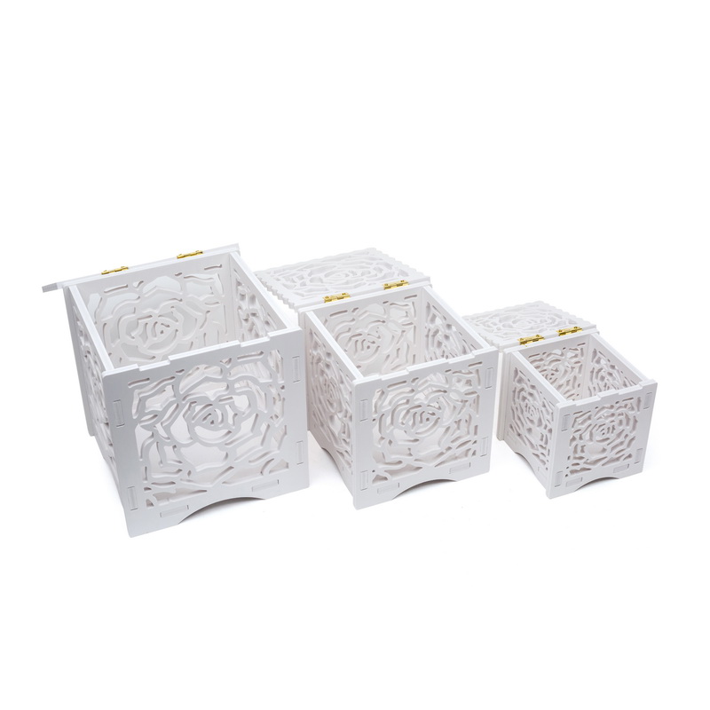 Прекрасни уникатни кутии за повеќе намени.Во нив може да  спакувате поклон,да си складирате ваши предмети а воедно ќе ви бидат и украс во вашата соба.Кутиите се изработени од материјал (Wood plastic board)што не ја загадува околината,многу е лесен, и водоотпорен.