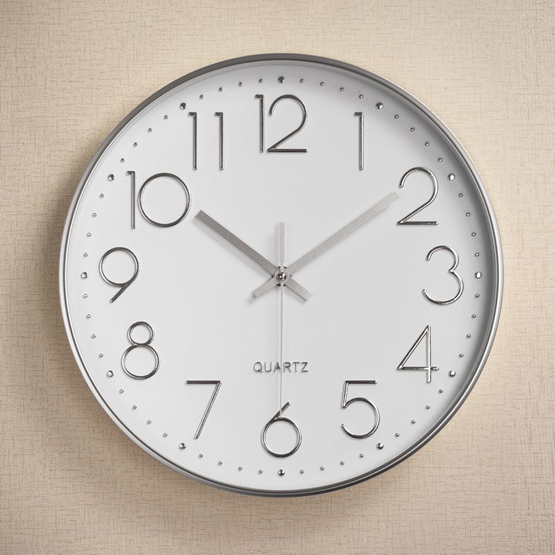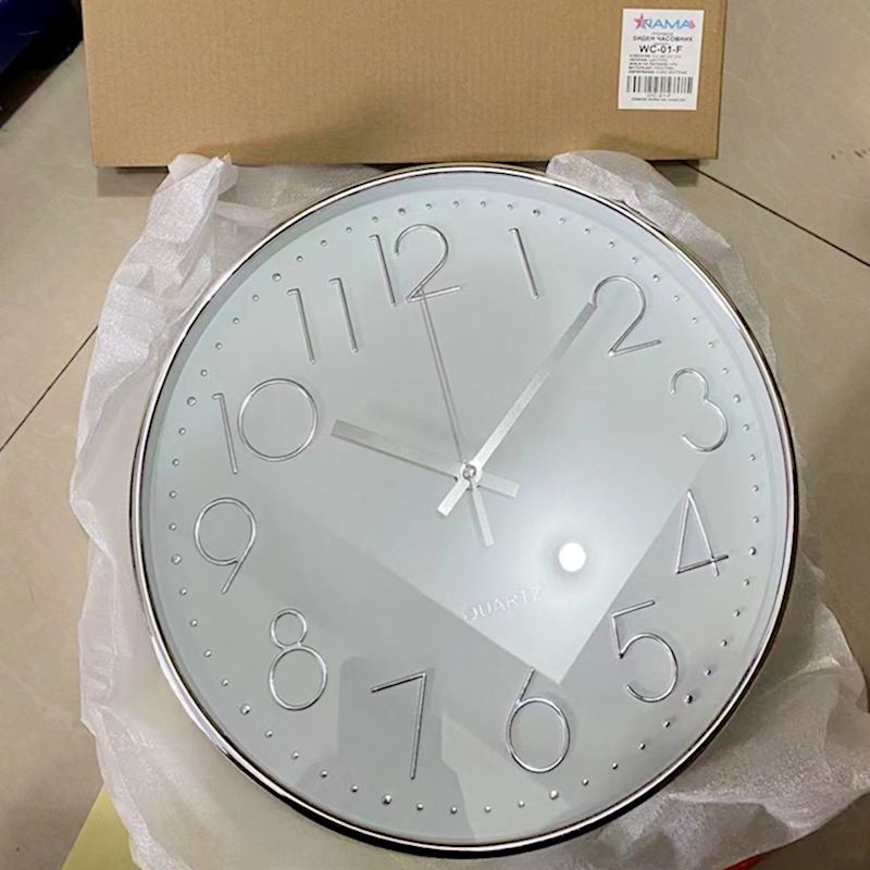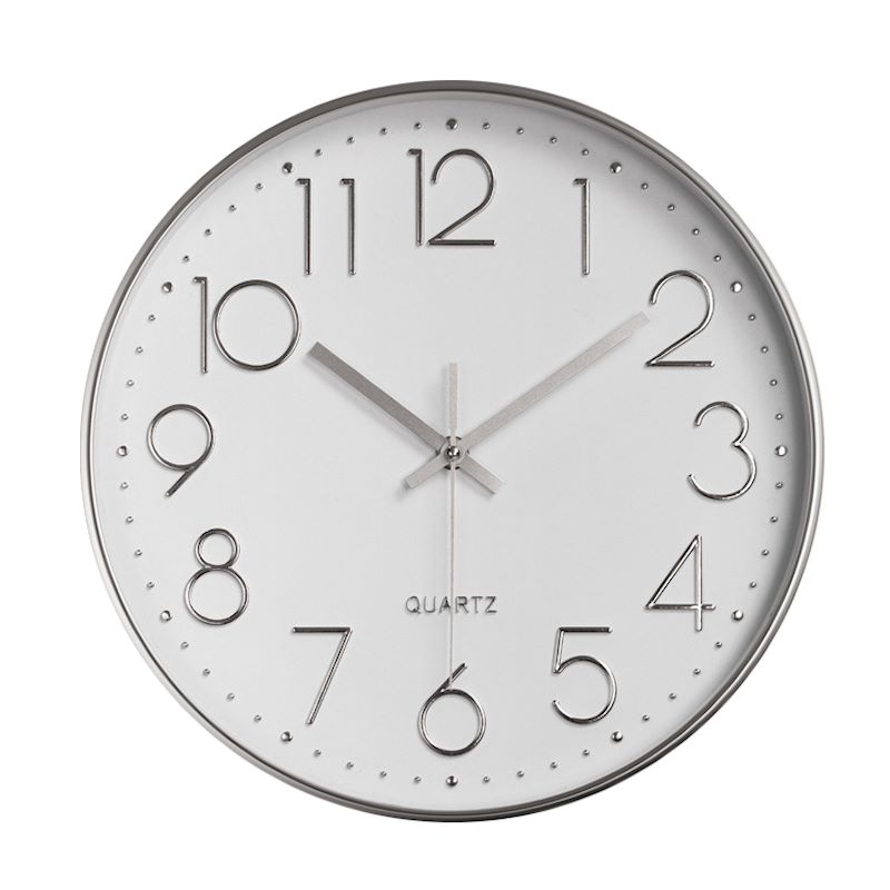 Високо квалитетен елегантен бел ѕиден часовник со сребрена рамка и сребрени бројки и срелки. Со тивок механизам и дијаметар од 30см.