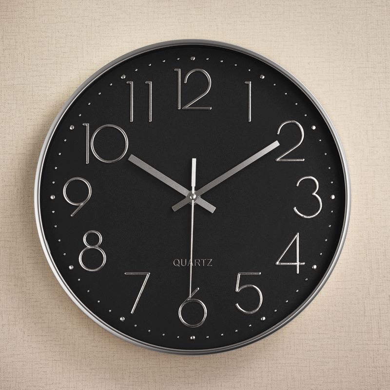 Високо квалитетен елегантен црн ѕиден часовник со сребрена рамка и сребрени бројки и срелки. Со тивок механизам и дијаметар од 30см.