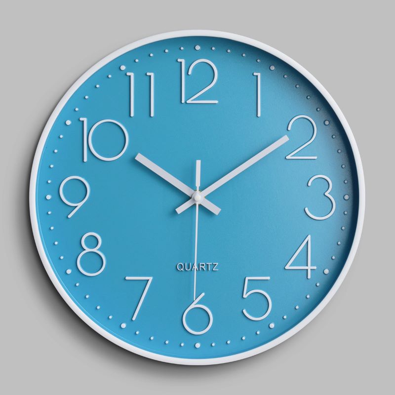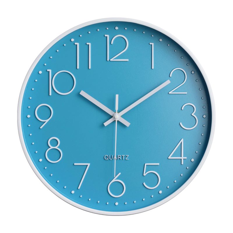 Високо квалитетен елегантен плав ѕиден часовник со бела рамка и бели бројки и срелки. Со тивок механизам и дијаметар од 30см.