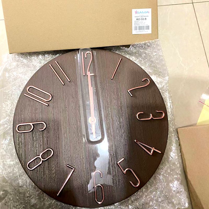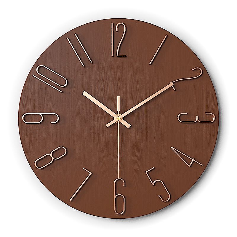 Високо квалитетен елегантен кафеав ѕиден часовник со бронзени бројки и срелки. Со тивок механизам и дијаметар од 30см.