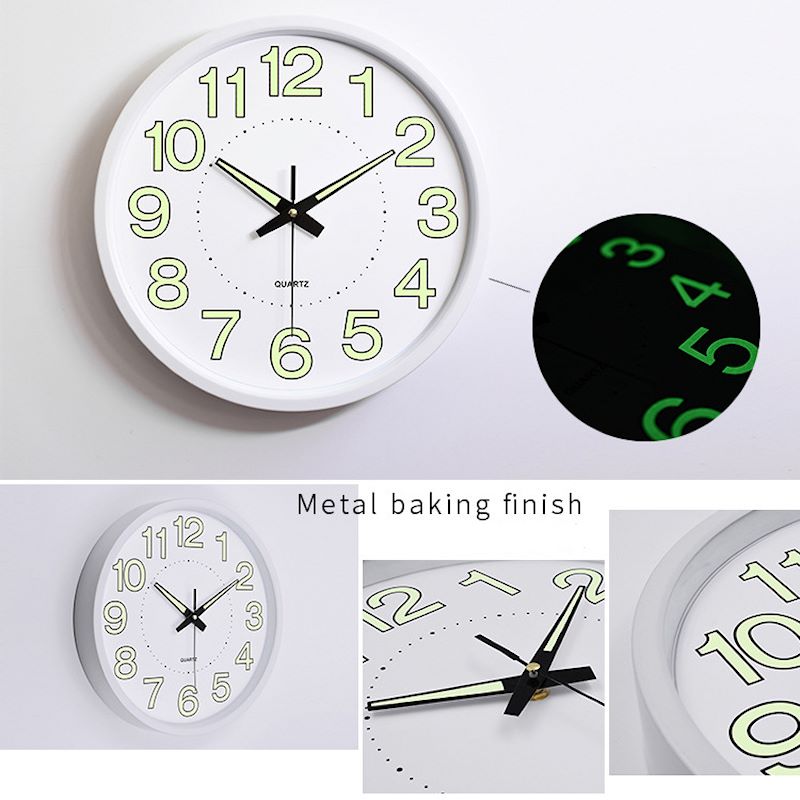 Со стилски и елегантен дизајн, овој часовник го трансформира вашето пространство во убаво и функционално место. Бројките и стрелките на часовникот се обележани со луминисцентен материјал, што овозможува читање на времето и во темнината. Оваа особина создава дополнителна функционалност, овозможувајќи преглед на времето без пречки дури и кога е потемно. Ова е особено корисно за ноќно време или во простории каде што светлината е многу слаба.